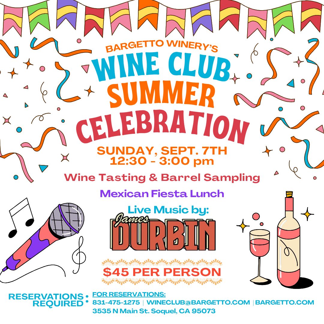 Bargetto Winery would like to invite Wine Club Members to our “Wine Club Summer Celebration” on Sunday, September 7th from 12:30-3:00 at our Creekside Courtyard.