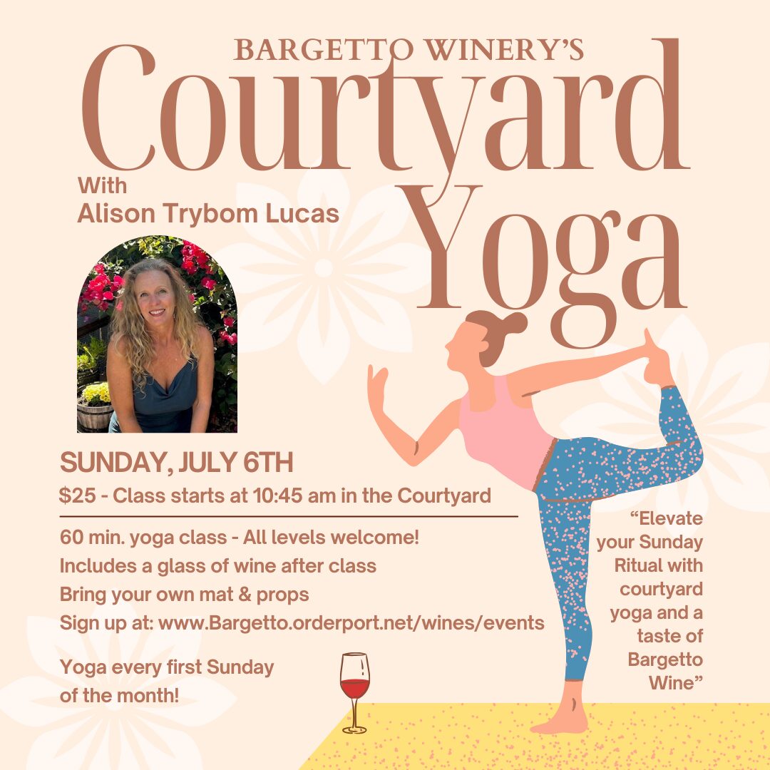 Bargetto Winery’s Courtyard Yoga with Alison Trybon Lucas. Elevate your Sunday ritual with Courtyard Yoga and a taste of Bargetto wine! $25 includes yoga class and a glass of Bargetto wine after class! Please bring your own mats and props…some blocks will be available. All levels welcome. Class is 60 minutes and starts at 10:45am in Bargetto Winery’s creekside courtyard! Limited TO 20 guests.