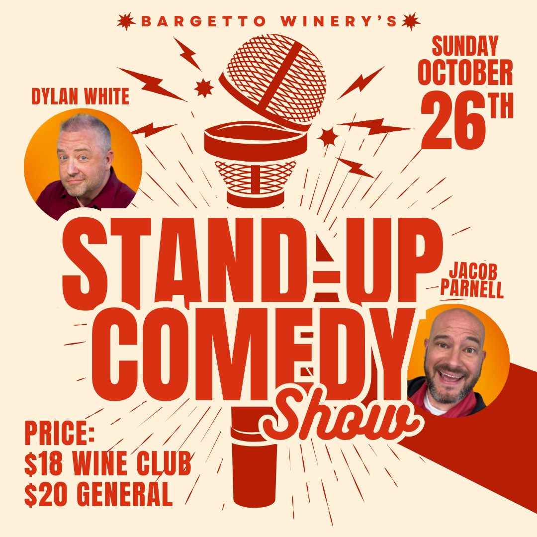 Join us at Bargetto Winery in Soquel on Sunday October 26th, 2025 for a Stand-Up Comedy Show featuring comedian Jacob Parnell and headliner comedian Dylan White!