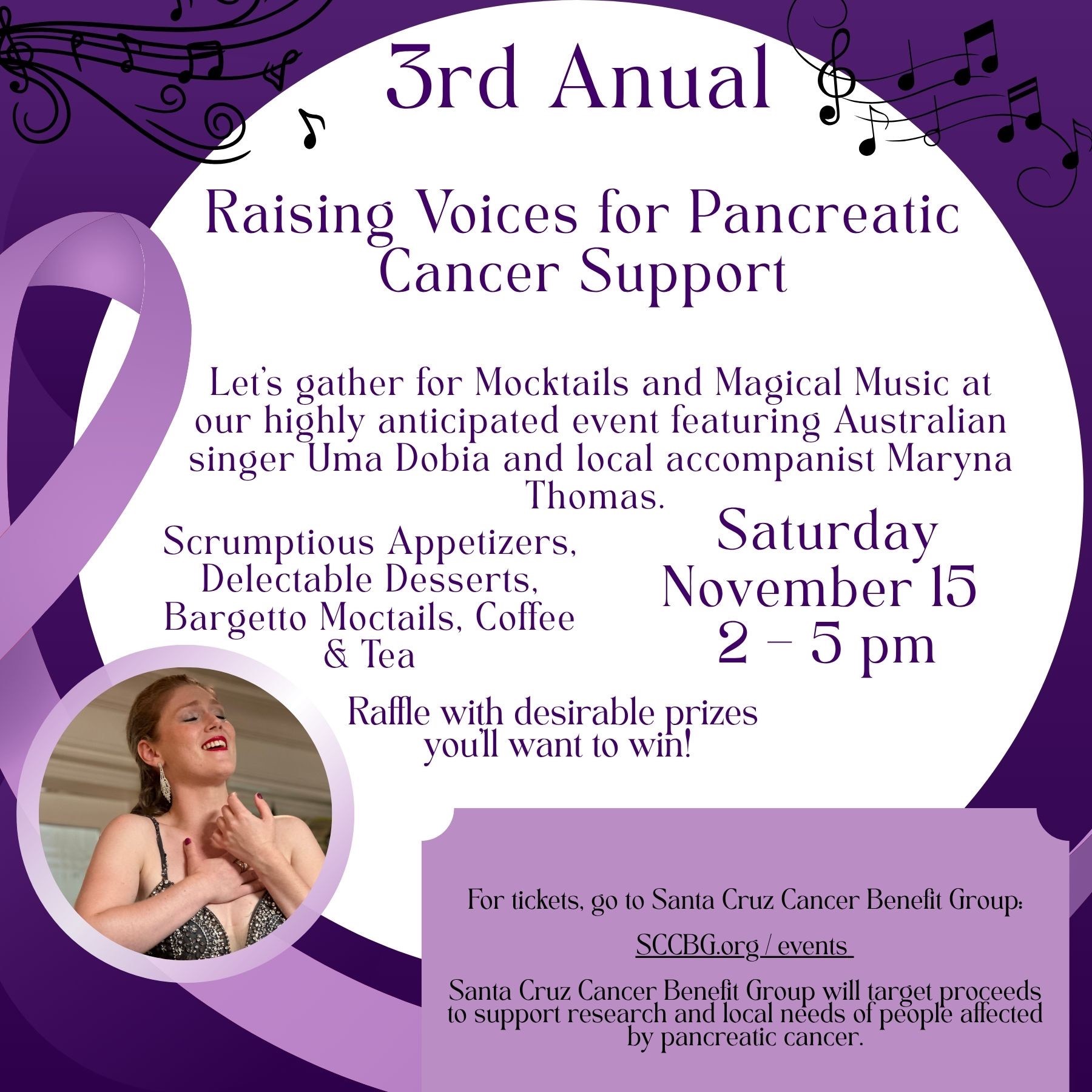 The Santa Cruz Cancer Benefit Group is hosting a Raising Voices for Pancreatic Cancer Fundraiser at Bargetto Winery. Let’s gather for Mocktails and Magical Music at our highly anticipated event featuring Australian singer Uma Dobia and local accompanist Maryna Thomas.