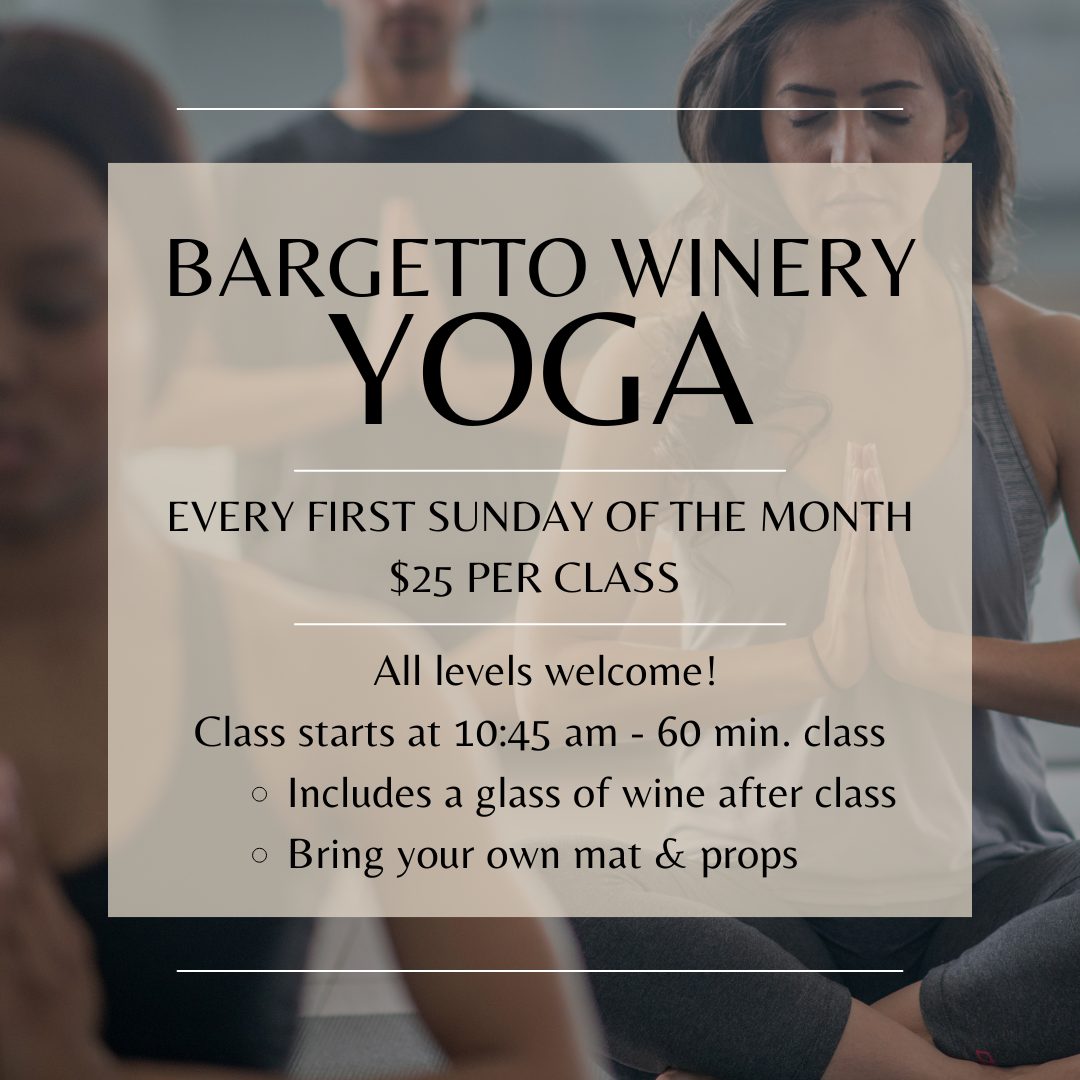 $25 includes yoga class and a glass of Bargetto wine after class!